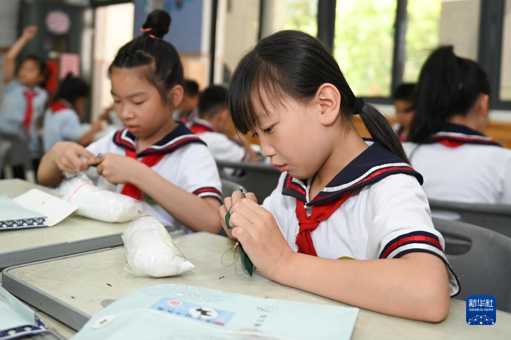 7月12日,学生在杭州市文渊小学的土布纺织技艺课堂上进行手工制作。
