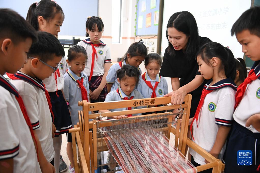 7月12日,学生在杭州市文渊小学的土布纺织技艺课堂上体验操作织布机。