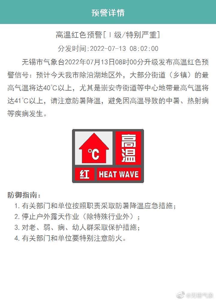 江苏省无锡市气象台2022年07月13日08时00分升级发布高温红色预警信号:预计今天无锡市除沿湖地区外,大部分街道(乡镇)的最高气温将达40℃以上,尤其是崇安寺街道等中心地带最高气温将达41℃以上,请注意防暑降温,避免因高温导致的中暑、热射病等疾病发生。