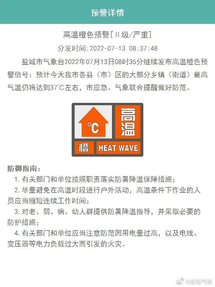江苏省盐城市气象台2022年07月13日08时35分继续发布高温橙色预警信号:预计今天盐城市各县(市)区的大部分乡镇(街道)最高气温仍将达到37℃左右,市应急、气象联合提醒做好防范。
