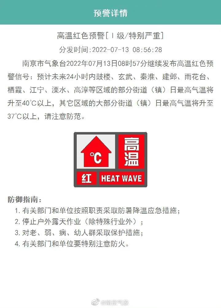 江苏省南京市气象台2022年07月13日08时57分继续发布高温红色预警信号:预计未来24小时内鼓楼、玄武、秦淮、建邺、雨花台、栖霞、江宁、溧水、高淳等区域的部分街道(镇)日最高气温将升至40℃以上,其它区域的大部分街道(镇)日最高气温将升至37℃以上,请注意防范。