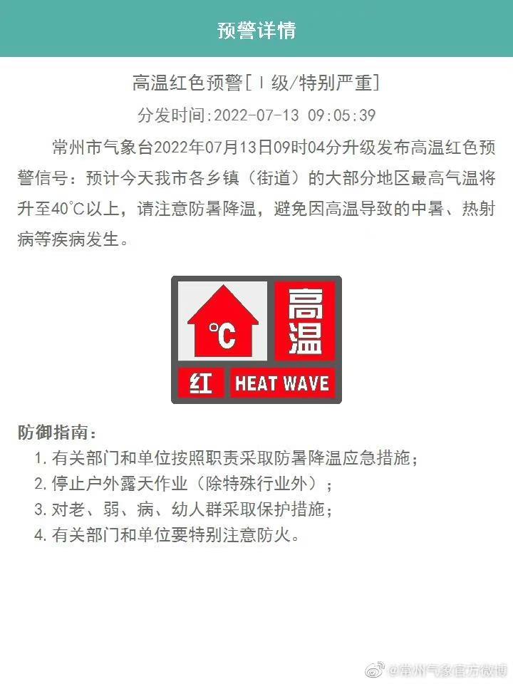 江苏省常州市气象台2022年07月13日09时04分升级发布高温红色预警信号:预计今天常州市各乡镇(街道)的大部分地区最高气温将升至40℃以上,请注意防暑降温,避免因高温导致的中暑、热射病等疾病发生。