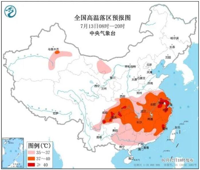 中央气象台7月12日18时继续发布高温橙色预警,预计7月13日白天,江苏南部、浙江北部、四川东南部、重庆大部、云南东北部局地可达40℃以上。
