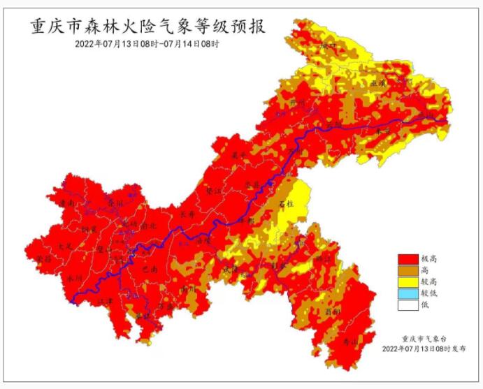 据重庆市气象台7月13日8时预报,未来24小时,重庆市中心城区、西部、西南部、中部、东南部(石柱除外)、东北部(除巫溪、城口)森林火险气象等级达到五级(极高危险),其余地区森林火险气象等级为三至四级(较高危险至高度危险)。各地须严密防范,严禁一切林区用火。