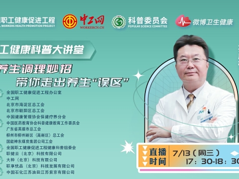 【直播回顾】职工养生调理妙招,带你走出养生“误区”(一)养生不仅有助于健康,还有利于心情的愉悦,让身心共同发展。而中医养生讲究的是方法,因此,正确的养生方法至关重要。7月13日17:30,北京积水潭医院感染疾病科主任医师孙成栋将从养生食品、养生误区等多个方面介绍中医养生的方法,带你走出养生“误区”。中工网首页、视频号、抖音、微博等平台同步直播。