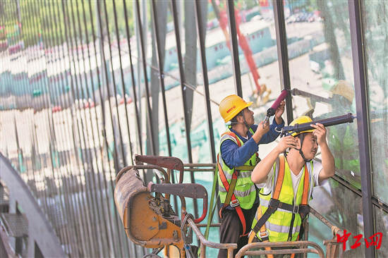 7月13日,首都博物馆东馆项目工地上,来自北京城建集团的田克珍(左)与儿子田宏强正在进行玻璃幕墙的安装工作。因为造型巧妙融合了船、帆、水三大元素,首都博物馆东馆一直享有“运河之舟”的美誉。