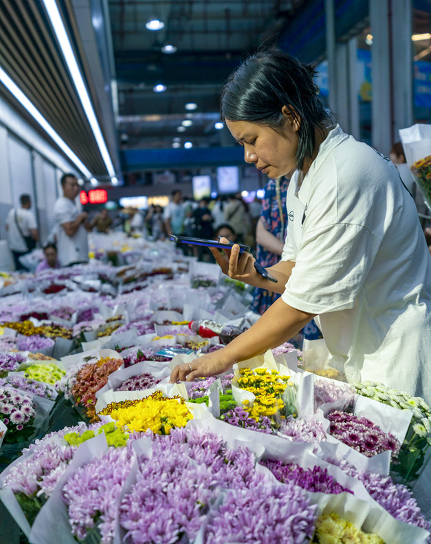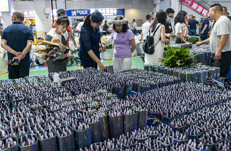 7月12日晚,游客在昆明斗南花卉交易市场内选购鲜花。新华社记者 陈欣波 摄
