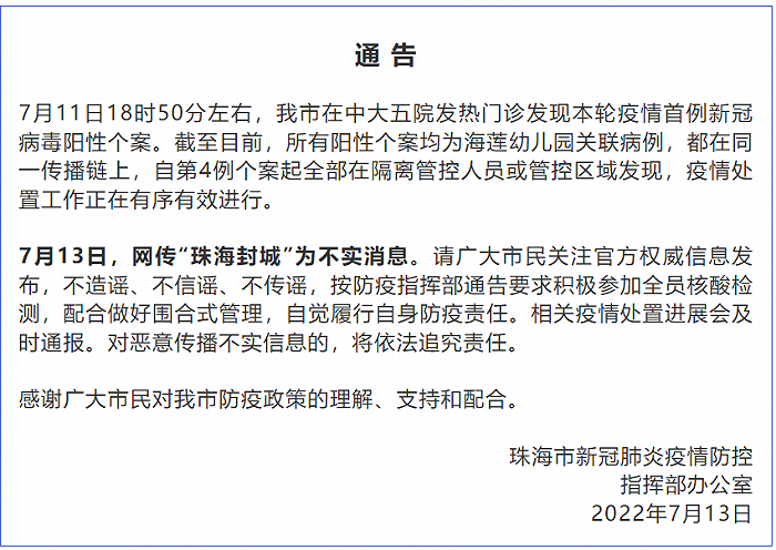 7月13日,网传“珠海封城”为不实消息。请广大市民关注官方权威信息发布,不造谣、不信谣、不传谣,按防疫指挥部通告要求积极参加全员核酸检测,配合做好围合式管理,自觉履行自身防疫责任。相关疫情处置进展会及时通报。对恶意传播不实信息的,将依法追究责任。