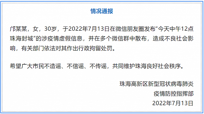 广东珠海:网传“珠海封城”为不实消息,3人散布谣言被处罚