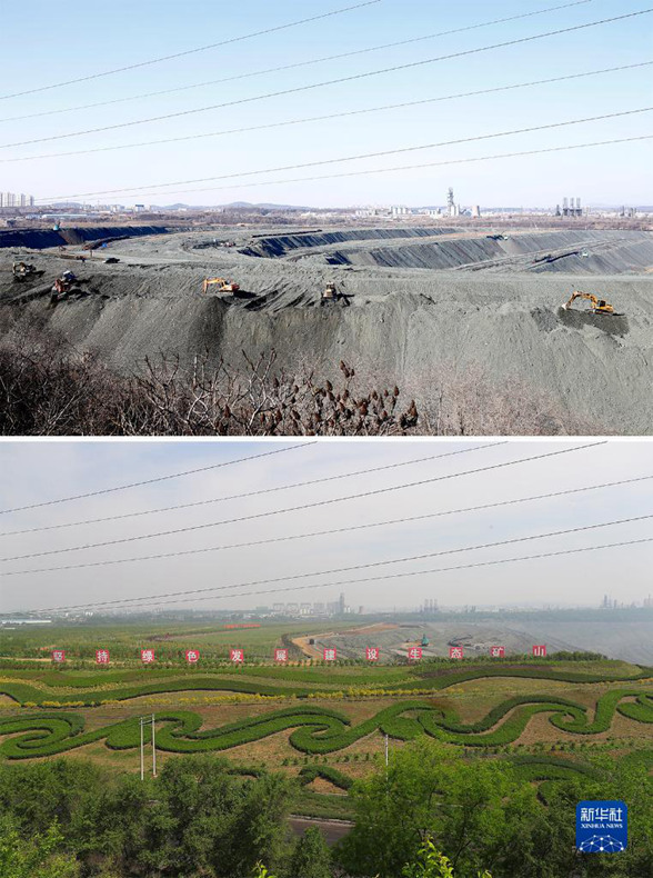 拼版照片:上图为辽宁省抚顺市西露天矿部分区域生态恢复前的场景(2019年3月6日摄,资料照片);下图为辽宁省抚顺市西露天矿部分区域生态恢复后的场景(新华社记者杨青2022年6月2日摄,无人机照片)。新华社发