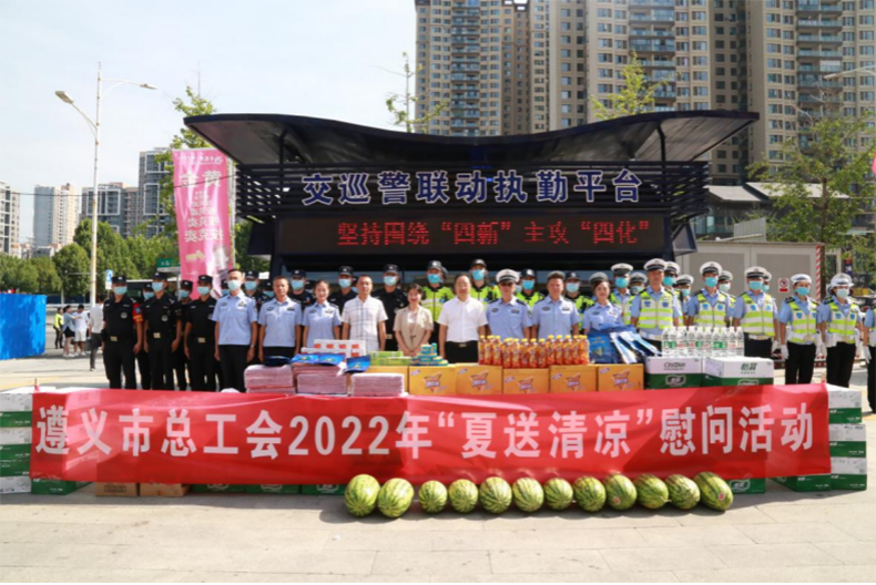 7月15日上午,市总工会党组书记、副主席向波率队深入新蒲新区林达阳光城、湿地公园广场,为奋战在一线的公安交警、综合执法人员和环卫工人送去西瓜、矿泉水、藿香正气水、茶叶等夏季防暑降温物品,这标志着遵义市总工会2022年“夏送清凉”活动正式启动。