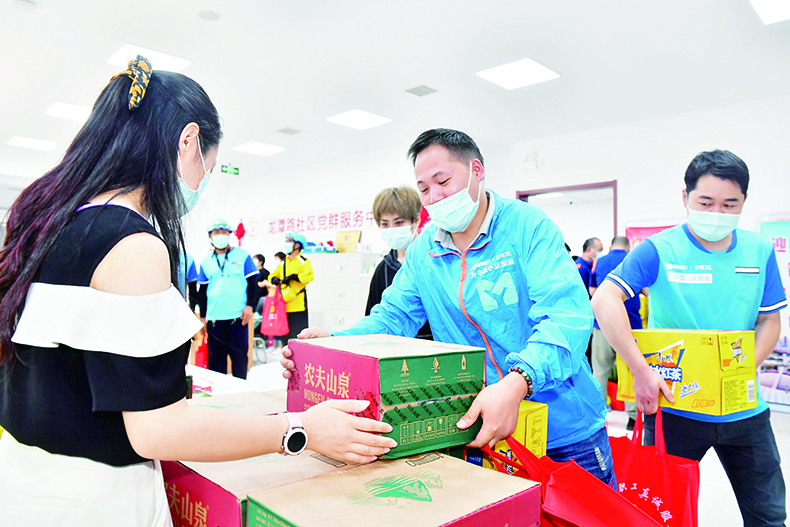 河东区工会干部为参加活动的环卫工人和新就业形态劳动者代表发放慰问品。 张磊/摄