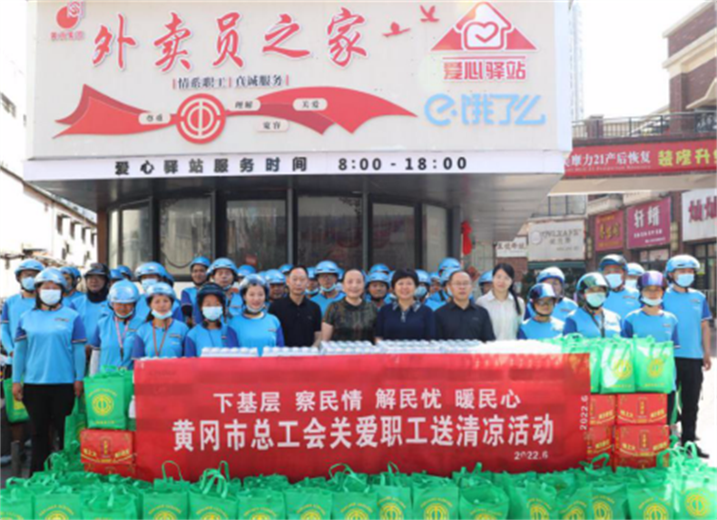 近日,黄冈市总工会党组书记、常务副主席杨艳红一行先后到湖北黄商网络科技有限公司(饿了么外卖公司)、黄冈临空经济区进出口产业服务中心项目工地,为外卖员和建筑工人(农民工)送去清凉包、矿泉水等慰问物资。