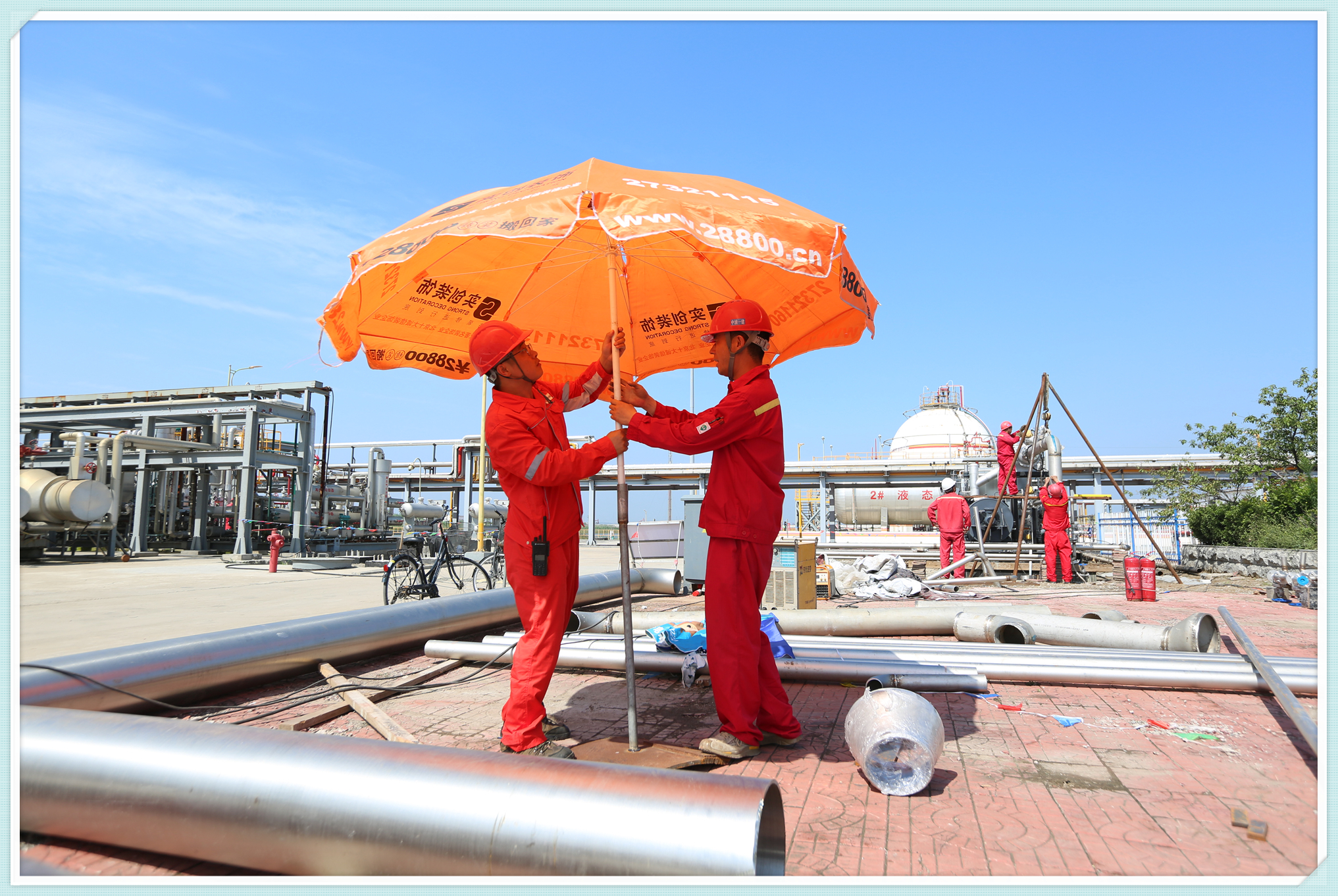 7月18日,在冀东油田油气集输公司高尚堡联合站天然气装置优化改造现场,施工人员正在安装遮阳伞,以避免在烈日下施工的作业人员中暑。为确保施工人员平安度夏,油气集输公司工会还组织人员购买了毛巾和防暑药物等送到施工现场。(中国石油冀东油田 杨军 王翔)