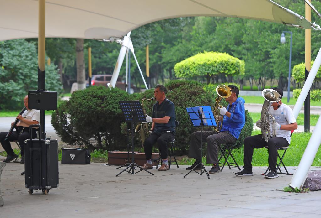7月5日,市民在细河U谷公园内演奏乐器。新华社记者 杨青 摄