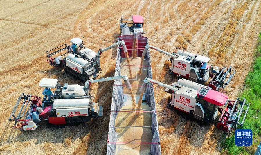 在合肥市蜀山区小庙镇段冲村,收割机将小麦装车,确保颗粒归仓(2022年5月25日摄,无人机照片)。新华社发(陈三虎 摄)