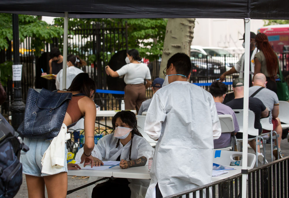 7月14日,人们在美国纽约一处疫苗接种点等待接种猴痘疫苗。新华社发(郭克摄)