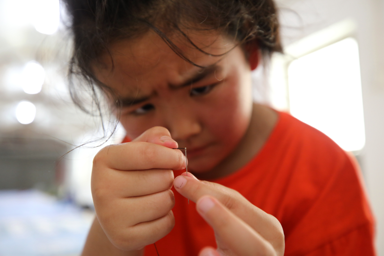 7月27日,安徽省淮北市职工夏令营开营当日,参加夏令营的少年儿童在宿舍自己动手认针缝补衣物。
