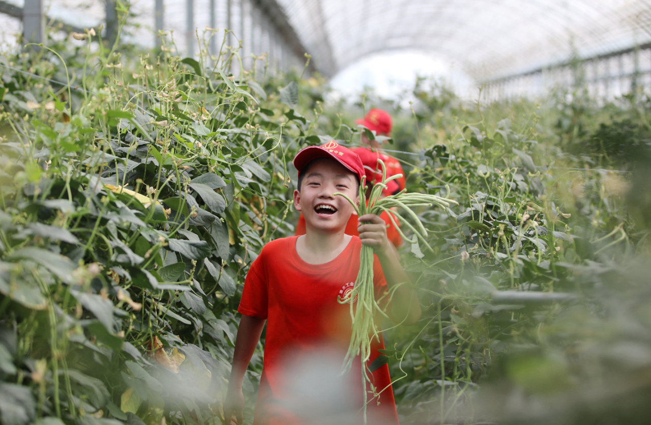 7月27日,安徽省淮北市职工夏令营开营当日,参加夏令营的少年儿童在农业园里体验做农活。(工人日报-中工网通讯员 张锋 刘静静)