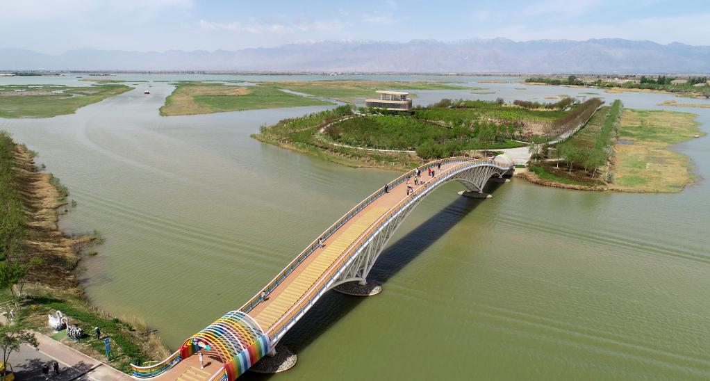 游客在沙湖景区湖东湿地游玩(无人机照片,4月30日摄)。新华社记者 王鹏 摄