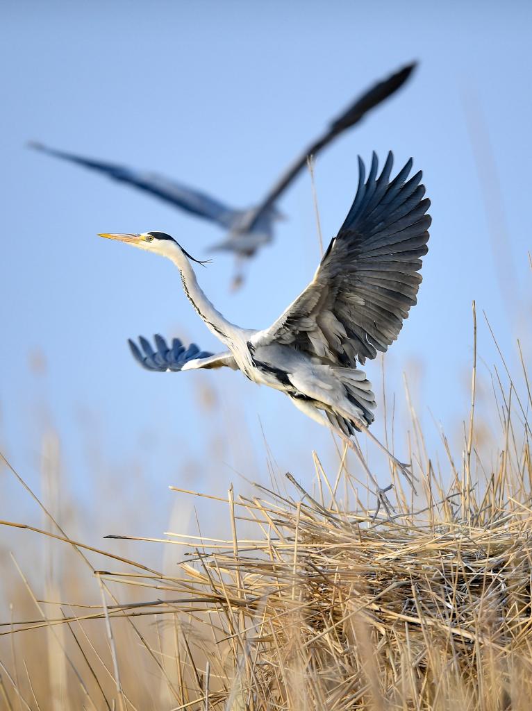 4月1日,苍鹭在沙湖景区栖息、飞翔。新华社记者 冯开华 摄