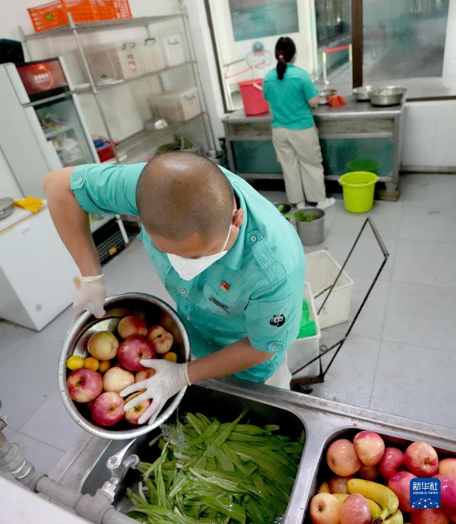 7月14日,在北京动物园猩猩馆,饲养员王争清洗果蔬为猩猩们准备早餐。