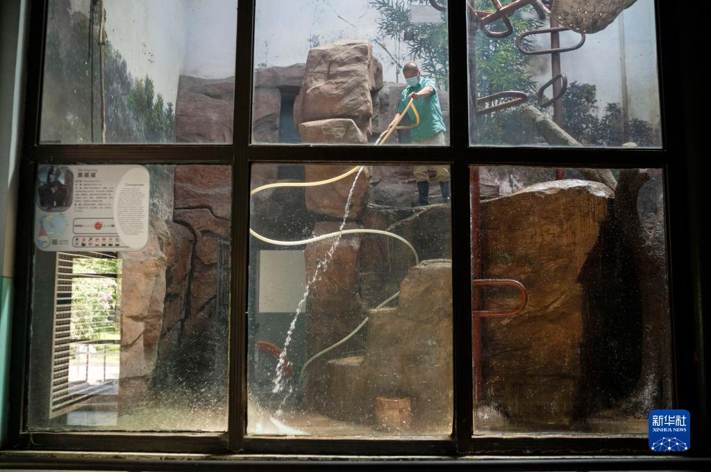 7月14日,在北京动物园猩猩馆巡查后,饲养员王争的衣衫已经被汗湿透。