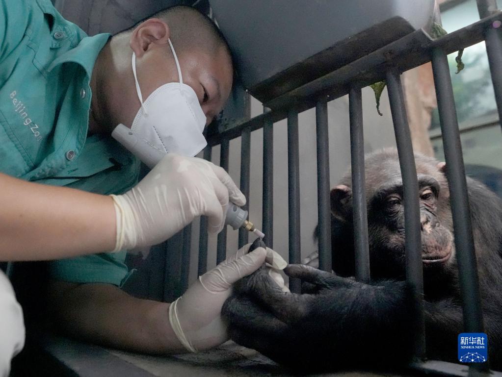 7月14日,在北京动物园猩猩馆,饲养员王争为黑猩猩“楠楠”修理指甲。