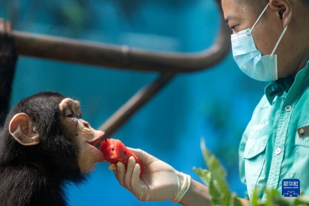 7月14日,在北京动物园猩猩馆,饲养员王争给小黑猩猩喂西瓜。