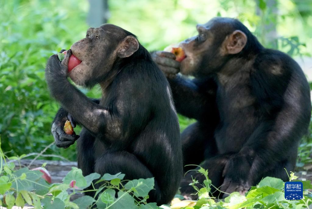 7月14日,在北京动物园猩猩馆,黑猩猩在吃水果。