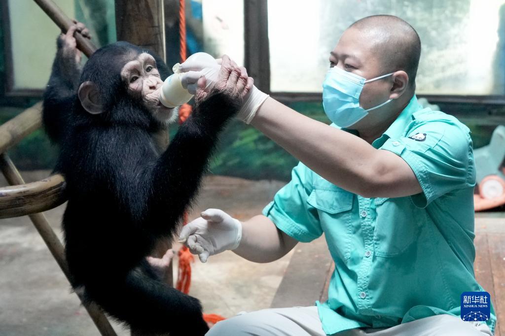 王争告诉记者,这么多年最欣慰的事情就是在2021年黑猩猩“楠楠”诞下了一只雌性幼仔,这是人工育幼长大的“楠楠”的第二次生产。第一次生产时,“楠楠”没有哺乳意识,王争和同事们为它播放黑猩猩带崽的视频,甚至亲自抱着玩偶示范,训练它自主哺乳。第二次生产后,“楠楠”终于学会了正确的抱崽姿势,并在人工辅助下成功哺乳幼崽。