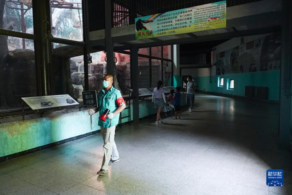 7月14日,饲养员王争在猩猩馆大厅里举着指示牌引导观众注意疫情防控。