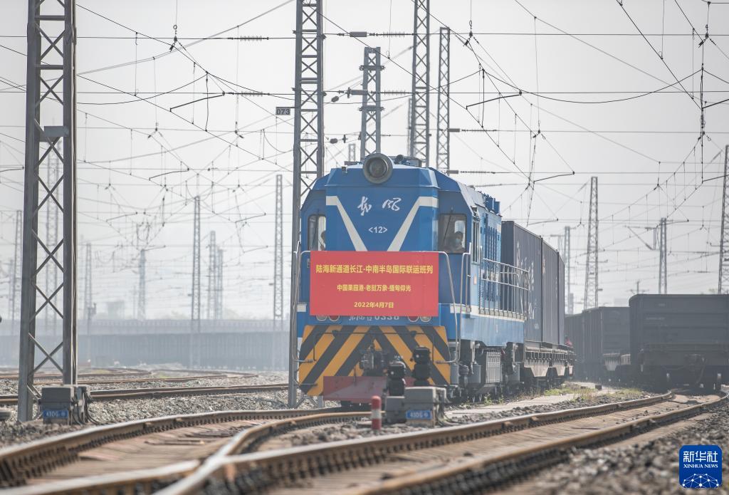 陆海新通道长江-中南半岛国际联运班列(中国果园港-老挝万象-缅甸仰光)从重庆果园港发出(2022年4月7日摄)。 新华社记者 黄伟 摄