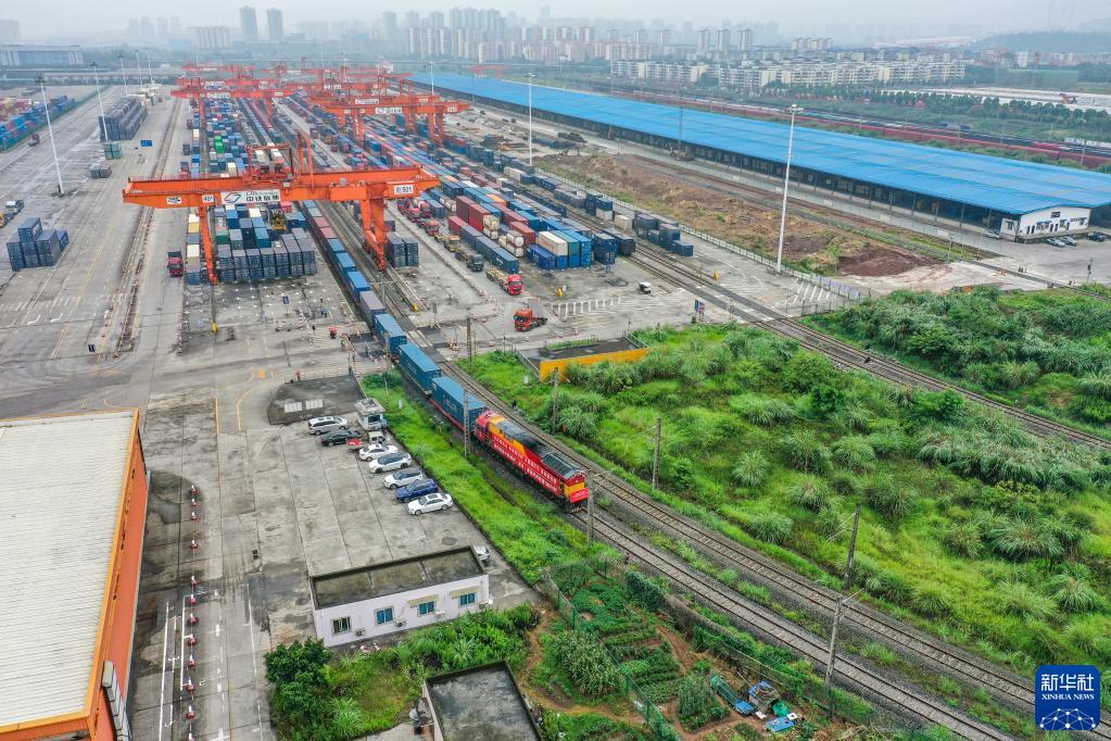 满载着电子产品、机械零件、日用百货等货物的中欧班列(重庆)第10000列列车从重庆团结村中心站驶出(2022年6月23日摄,无人机照片)。 新华社记者 黄伟 摄