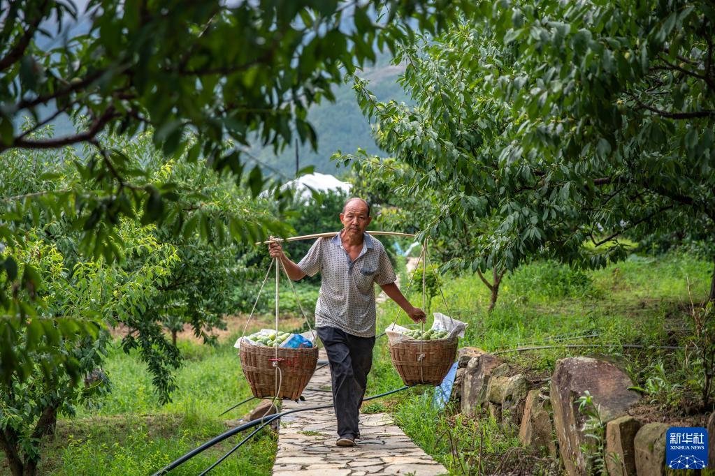 在巫山县曲尺乡柑园村,村民张兴前在挑运脆李(2022年7月2日摄)。 新华社记者 黄伟 摄