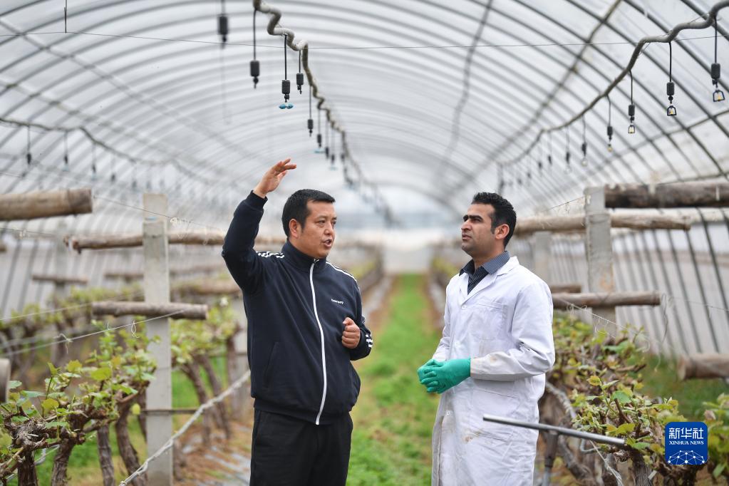 2021年3月17日,来自巴基斯坦的留学生(右)在陕西杨凌锦田农业专业合作社向当地职业农民了解水肥一体化灌溉设备。 新华社记者 张博文 摄