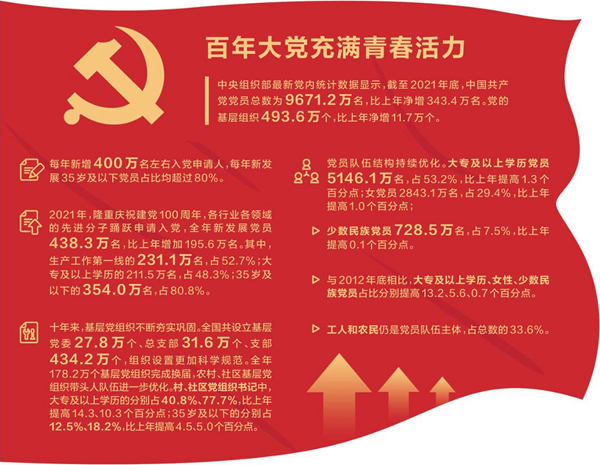 “当下,出现了年轻人积极加入党组织的新气象,青年勇挑大梁、争当先锋,赓续红色血脉,掀起入党热潮,这是十年来我们坚持党的全面领导、全面从严治党的显著成果。”中央党校(国家行政学院)党的建设教研部教授强舸指出,中国共产党一路走来,始终把基层党组织和党员队伍建设作为党的建设的基础性工作,一大批先进分子特别是优秀青年被源源不断吸收到党内,充分彰显了中国共产党强大的生机和活力,激发了青年干事创业的精气神,这正是中国共产党百年大党青春永驻、具有持久生命力与澎湃活力的密码所在。