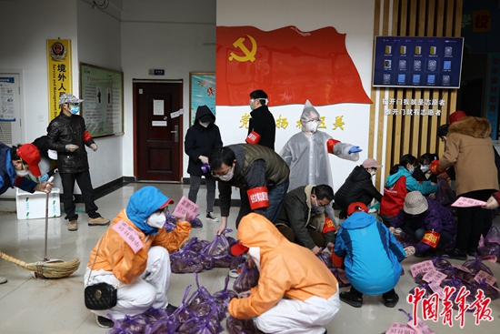 2020年2月23日,湖北省武汉市华锦花园小区,参加疫情防控服务的志愿者在整理准备送给住户的菜品。中青报·中青网记者 赵迪/摄