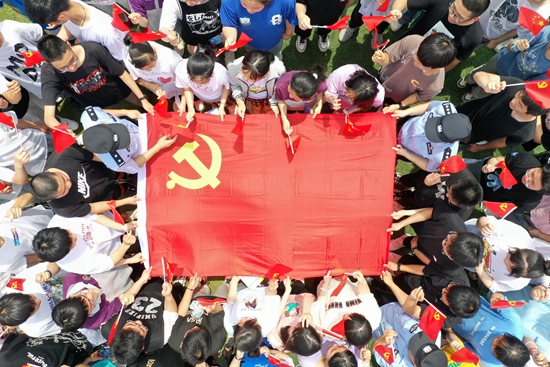 今年6月23日,安徽芜湖,民警、学生手持党旗,围在党旗四周,共同学习党旗知识。人民视觉供图