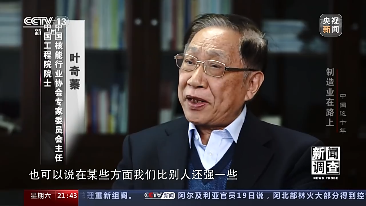 中国工程院院士 中国核能行业协会专家委员会主任 叶奇蓁:从总的技术水平可以这样说,我们已经从跟跑进入了并跑,也可以说在某些方面我们比别人还强一些。