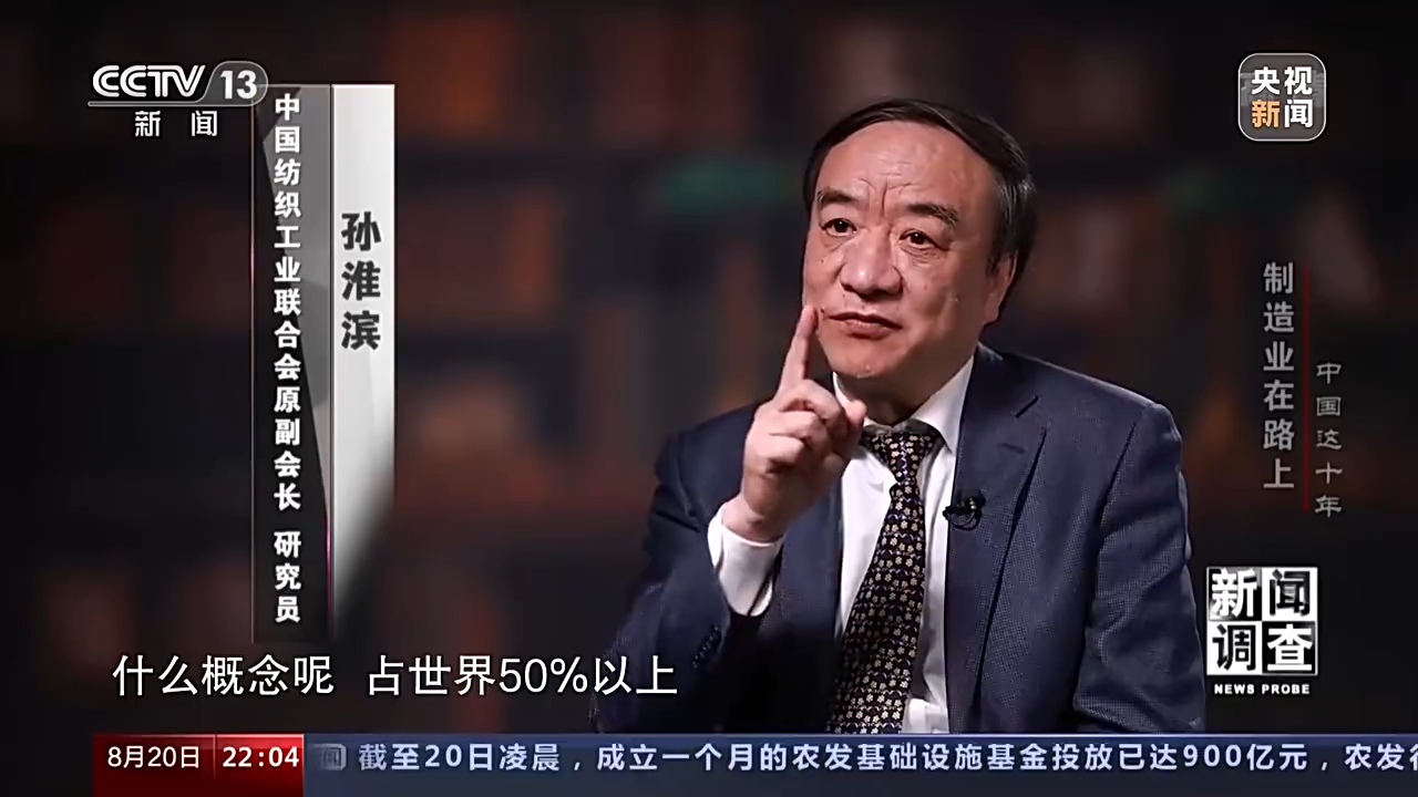 中国纺织工业联合会原副会长 研究员 孙淮滨:生产规模,我们是最大,现在一年大概纤维加工总量是5800万吨,什么概念呢,占世界50%以上,我们(纺织品服装)出口去年是3160亿美元,是世界的三分之一还多一点。