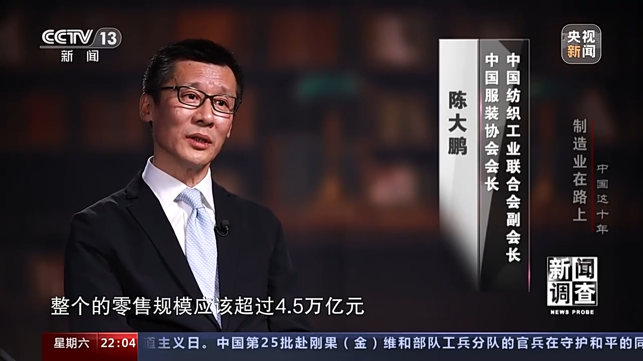 中国纺织工业联合会副会长 中国服装协会会长 陈大鹏:按照我们中国服装协会的推算,现在中国的服装市场整个的零售规模应该超过4.5万亿,网上的零售已经超过2万亿。