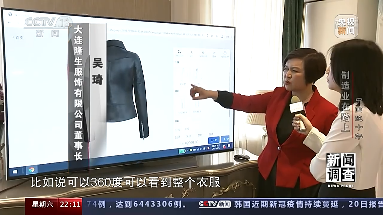 大连隆生服饰有限公司董事长 吴琦:然后这里面你看比如说可以360度可以看到整个衣服,然后比如说拉链,如果有些客户她不喜欢拉链可以变成扣子,我们从面料的材质,从颜色,从款式的细节客户都可以参与。