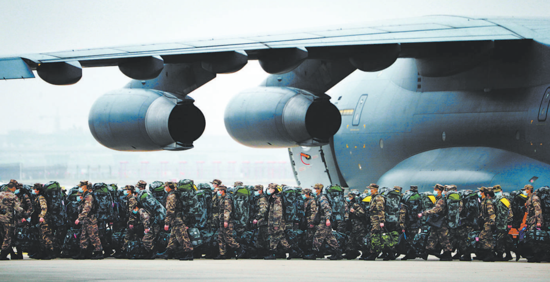铁翼鲲鹏,紧急驰援。2020年2月13日,运-20运输机满载着又一批军队支援湖北医疗队队员和医疗物资,抵达武汉天河机场。首次参加非战争军事行动的运-20,见证了新时代人民军队一次举世瞩目的卫勤力量大集结——继除夕夜450多名“白衣战士”逆行江城之后,空军分别于2月2日、13日、17日,连续出动3批次27架大中型军用运输机,从沈阳、兰州、广州、南京、乌鲁木齐、西宁、天津、张家口、成都、重庆等机场起飞,向武汉空运军队医疗队员和前方急需物资。 王传顺 摄