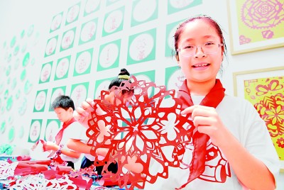 合肥市六安路小学翠微分校的学生展示剪纸作品。新华社发