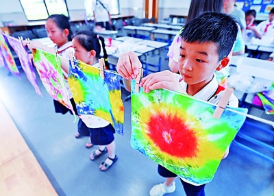 湖州市吴兴实验小学的学生把做好的扎染作品挂在教室里。新华社发