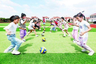 山东省青岛市即墨区龙山街道前东葛村,孩子们一起玩“听口令、抢排球”游戏。新华社发
