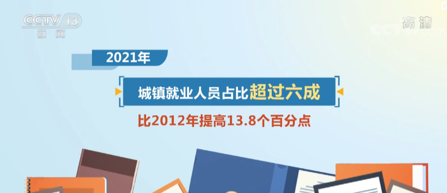 这十年,城乡就业格局发生历史性改变,2021年城镇就业人员占比超过六成,比2012年提高了13.8个百分点。就业结构不断优化,第三产业吸纳就业能力增强,从业人员占比从2012年的36%提升到2021年的48%。失业水平保持低位,城镇调查失业率总体低于预期控制目标。