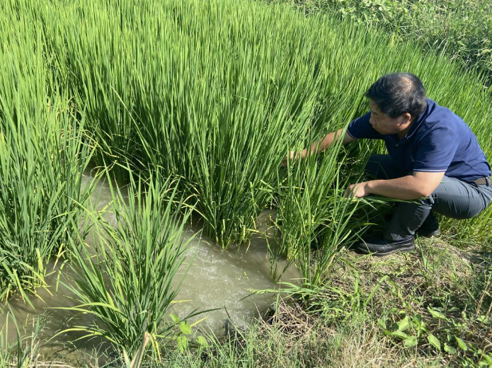 下午5点多,田间依旧热浪滚滚。湖北省襄阳市樊城区牛首镇上堰村的稻田边,该镇农业技术推广服务中心主任陈富华俯身拨开稻子,仔细查看稻飞虱等病虫害情况。