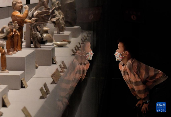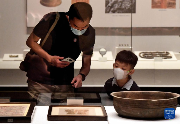 9月4日,一名小朋友在“文明的渊薮——河南百年百大考古发现展”上观看展品。新华社记者 李安 摄